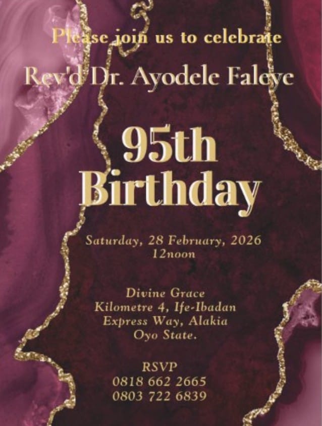 The family of Rev’d Dr. Ayodele Faleye has announced plans for the grand celebration of their father’s 95th birthday, scheduled to hold on Saturday, February 28, 2026.