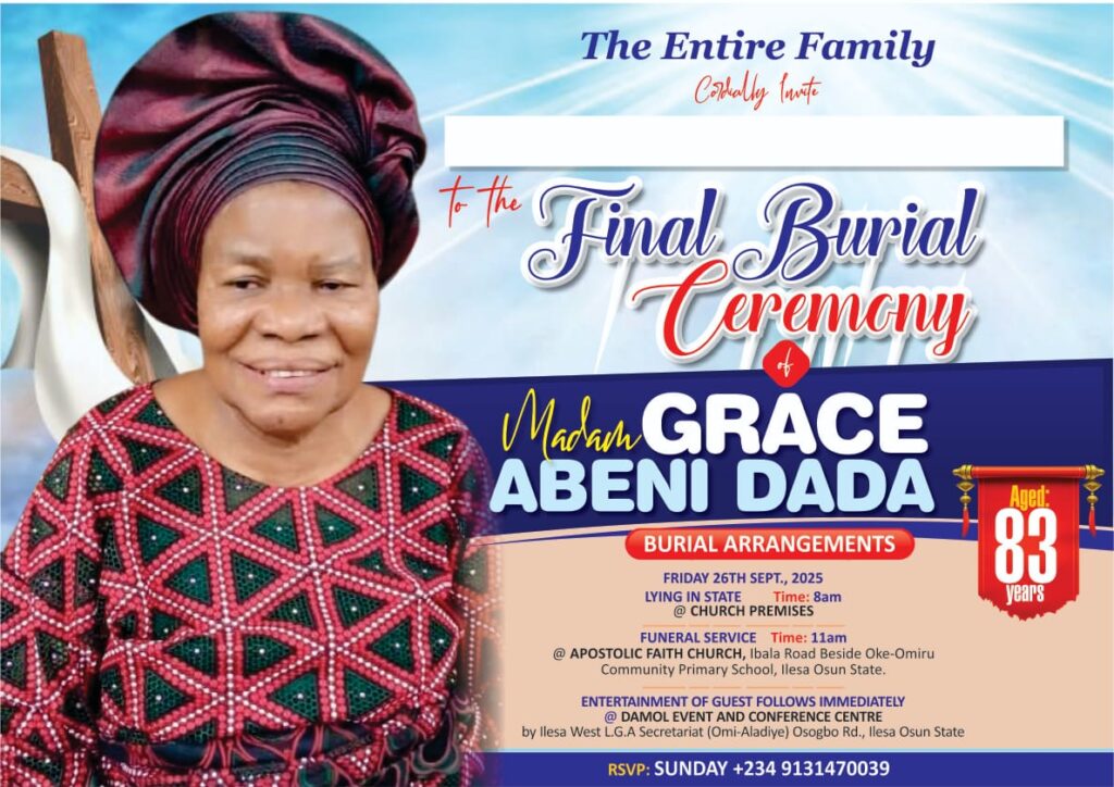 The family of Madam Grace Abeni Dada has announced the arrangements for her final burial ceremony, which will take place on Friday, September 26, 2025, in Ilesa, Osun State.