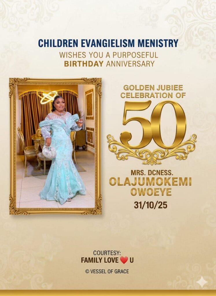 It’s celebration galore as family, friends, colleagues, and associates rejoice with Mrs. (Deaconess) Olajumokemi Sosanya Owoeye — a distinguished professional, devoted minister of the gospel, and loving wife and mother — on the joyous occasion of her Golden Jubilee today, October 31, 2025.