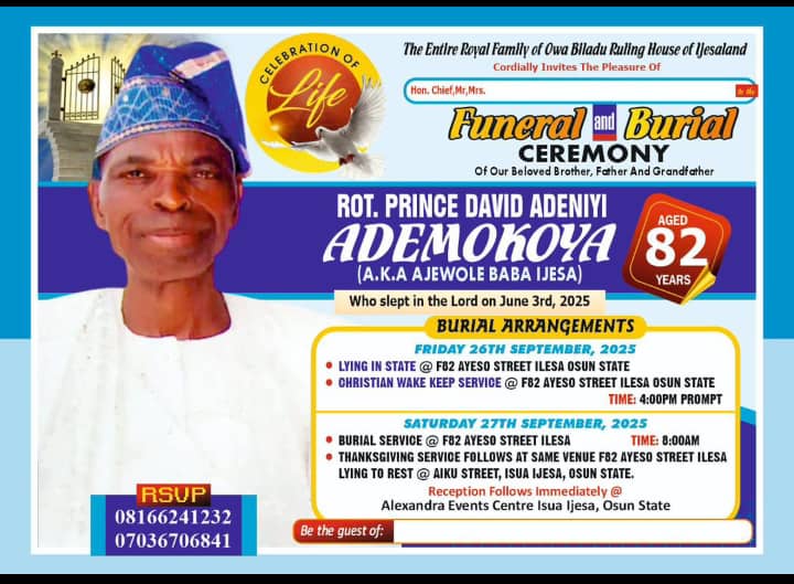 A release issued by one of his children, Prince Ademola Ademokoya indicates that Lying-in-state will take place on Friday, September 26th, 2025, at F82 Ayeso Street, Ilesa, Osun State, followed by a Christian- Wake Service at 4:00 pm.