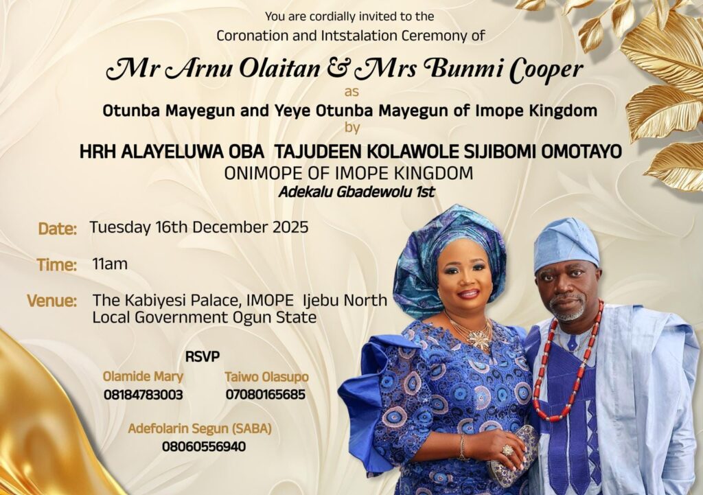 The coronation and installation are scheduled for Tuesday, 16th December 2025, at 11am, and will take place at The Kabiyesi Palace, Imope, Ijebu North Local Government, Ogun State.
